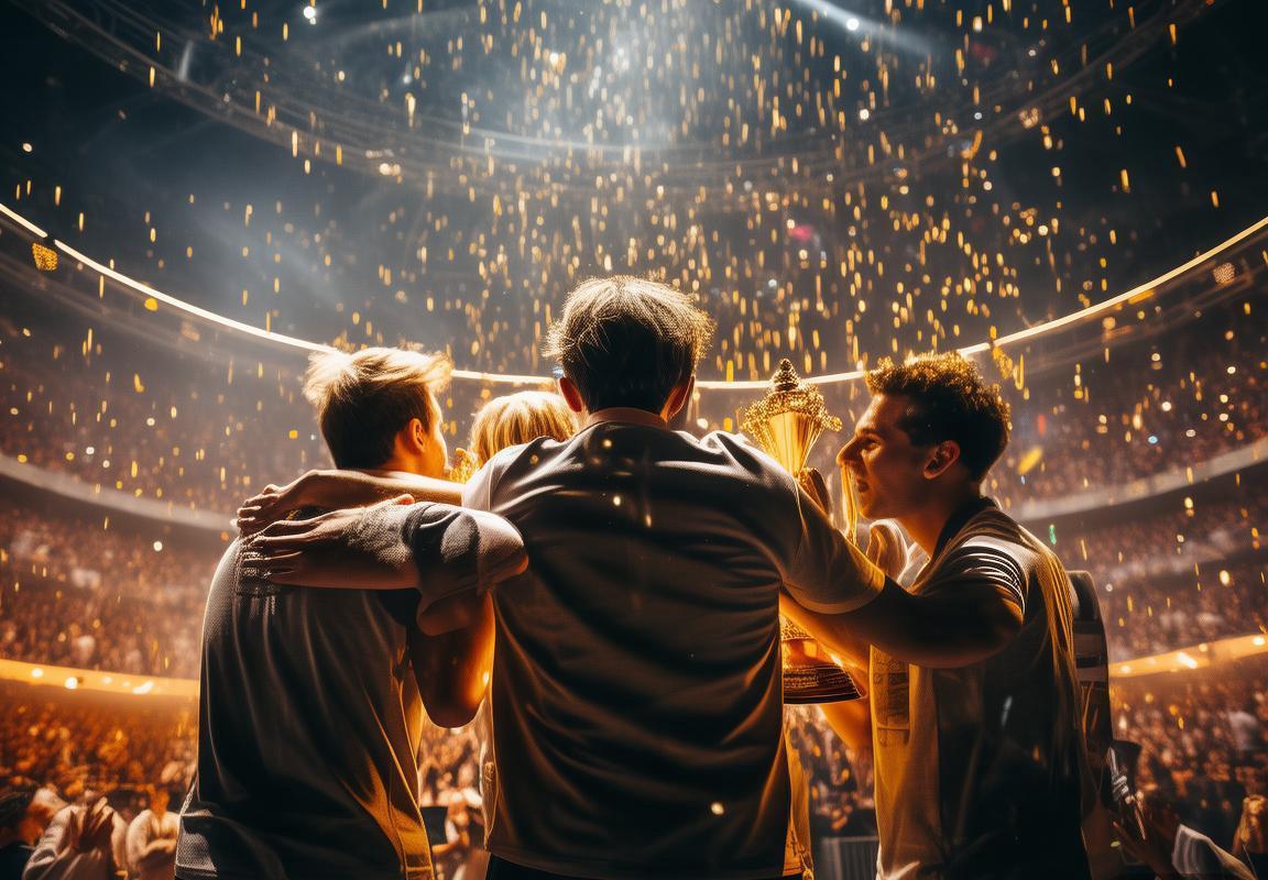 万众瞩目下,战队成员紧紧相拥,金色的雨洒满舞台。队长高举奖杯,眼中闪烁着激动的泪光。全场观众齐声高呼战队的名字,掌声雷动。他们凭借默契的团队配合与坚韧的毅力,在决胜局完成惊天逆转。这一刻,所有的汗水与付出都化为无上的荣耀,将被永远铭记在电竞史册中。